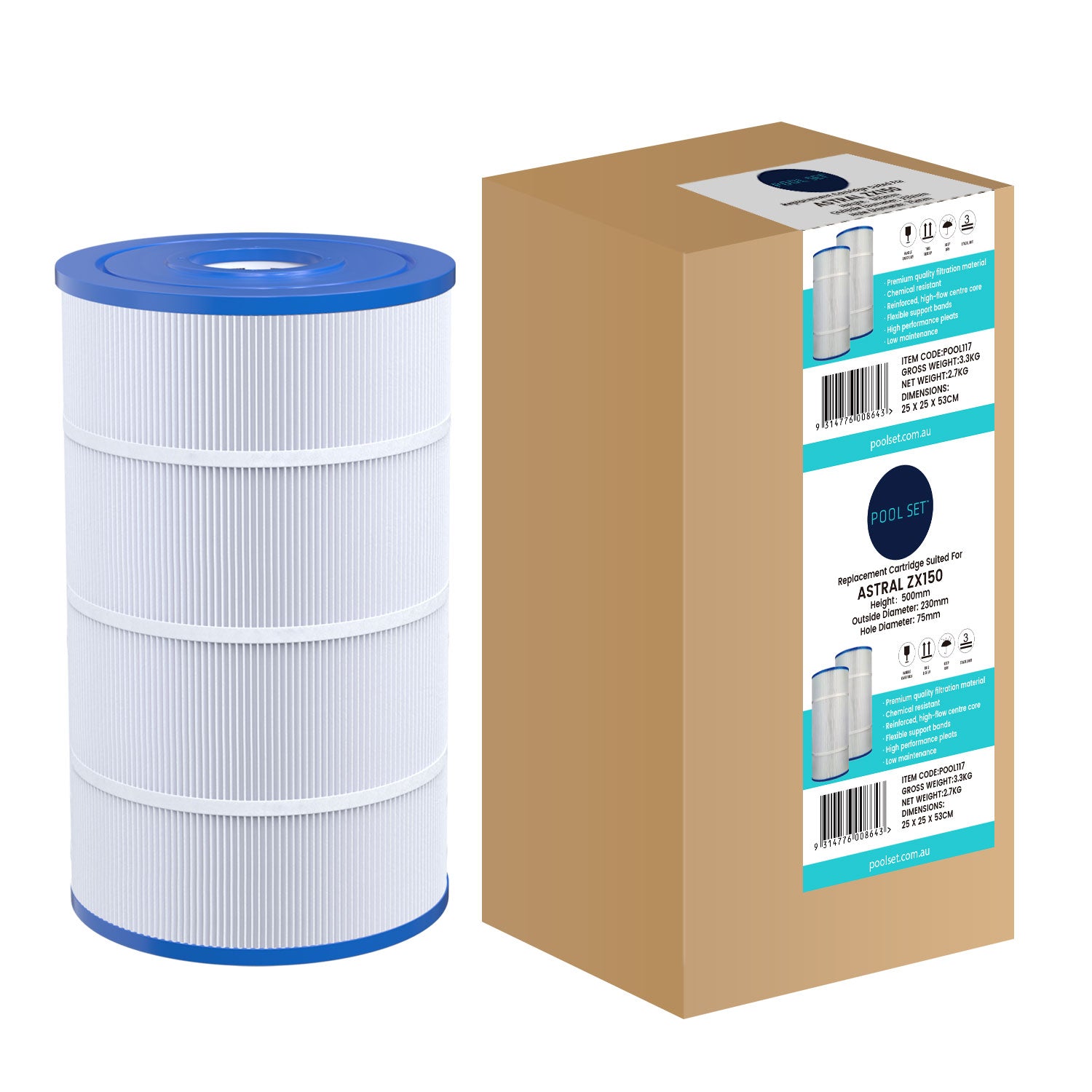 Pool Set replacement cartridge filter elements for Astral ZX150 are high quality and durable cartridges that will stand the test of time in Australian conditions and Australian pools. Built with high quality trilobal filtration fabric these elements will last longer and filter better. Made with highly durable ABS plastic end caps and backed up by Pool Set's fantastic after sales technical support.